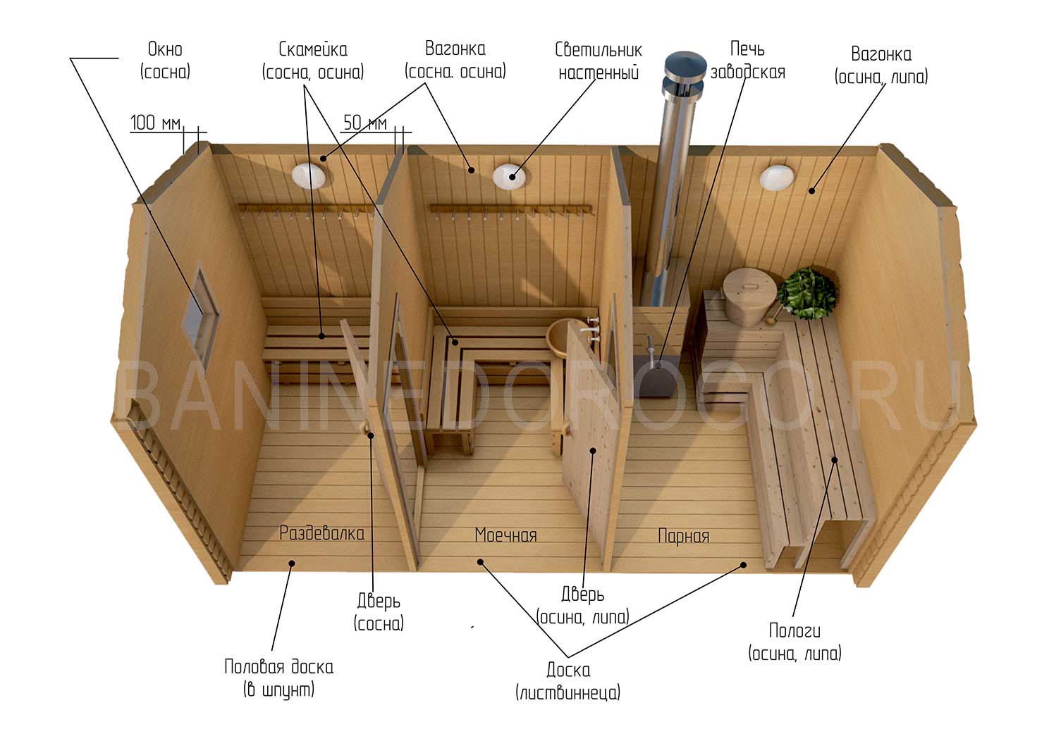 В отделке применяются материалы категории В,С. Пол делается из половой доски, внутренние стены из вагонки.